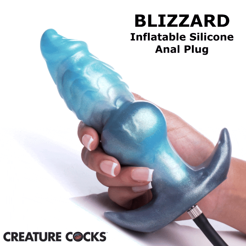 The Blizzard goes in at 2.3 inches of girth. That is the starting point. Tapered tip, spiral ridges twisting down the upper shaft, dragging against your walls on the way in. Already not smooth. Already working. Once the crescent base is flush against your body, you pick up the pump and start squeezing.