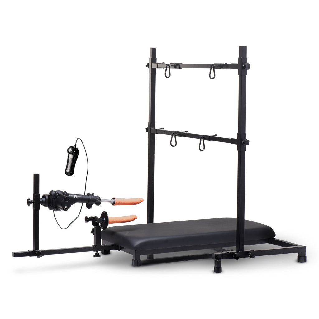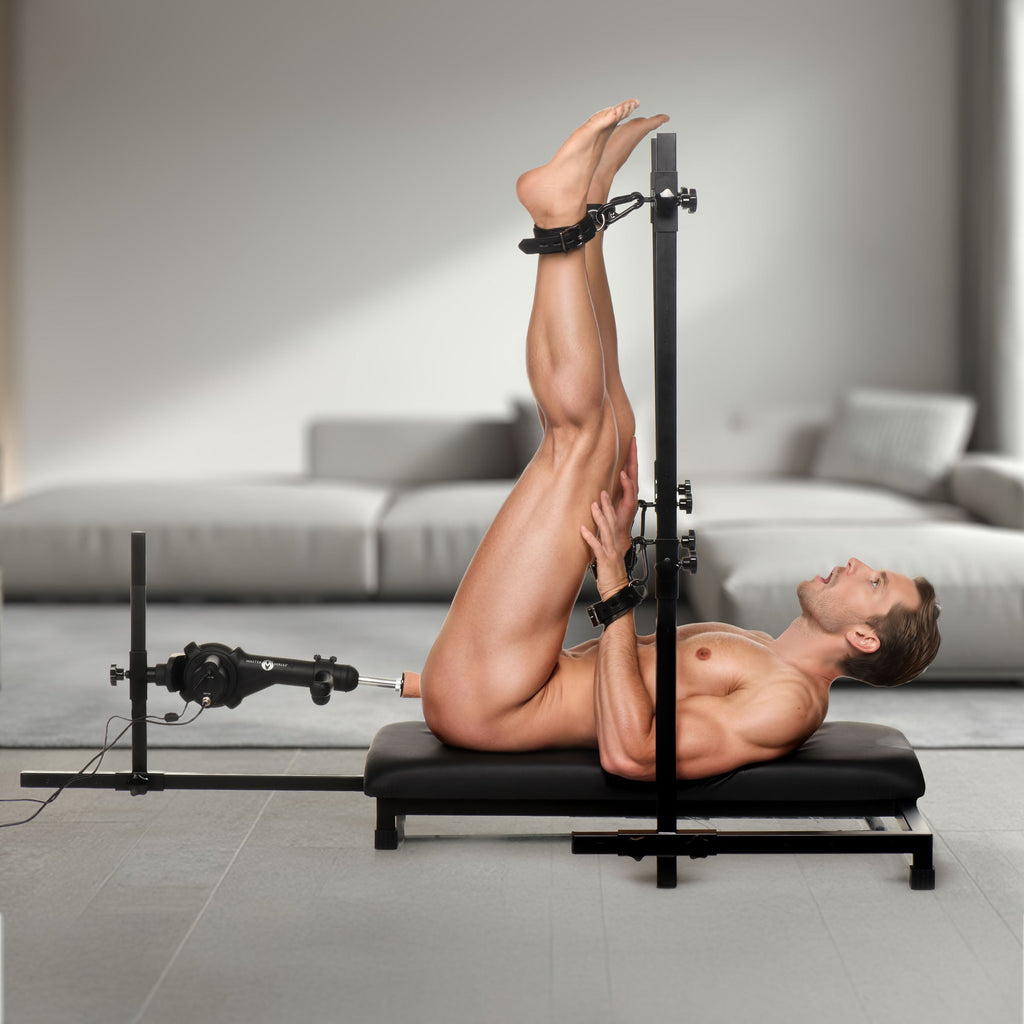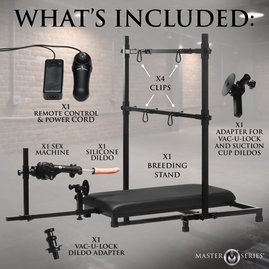 Get your hole ready for a relentless pounding with the Breed Master Breeding Stand and Sex Machine! With nonstop, uninterrupted fucking, this machine is connected directly to a power source so you can go all night! Give yourself a good pounding or hand the variable speed dial over to Sir for Them to puppeteer your pleasure. Adjust angles easily to hit your P-spot or accommodate changing positions. Built tough, this steel frame holds a solid wood platform that's covered in foam and vegan leather. Have Sir strap you in, cuff your wrists and ankles to the bars, and use you as They want. Become a breedable little pig and find out just how fuck-hungry that horny hole is! Show up and prove how much you can handle!