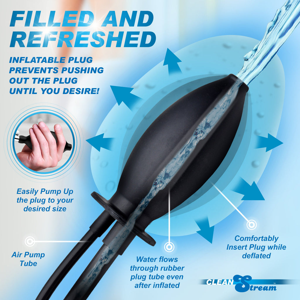 Enjoy filling up your partner with this comfortable enema butt plug. This plug pumps up to fill your partner and lock in the enema liquid. This is ideal for those attempting to introduce and hold a large volume of liquid. This enema butt plug has a rubber tube running through it so that fluids can pass through while inflated. Once the plug is inserted and inflated the large rubber hose can be connected to an enema bag or the Inline Enema Bulb