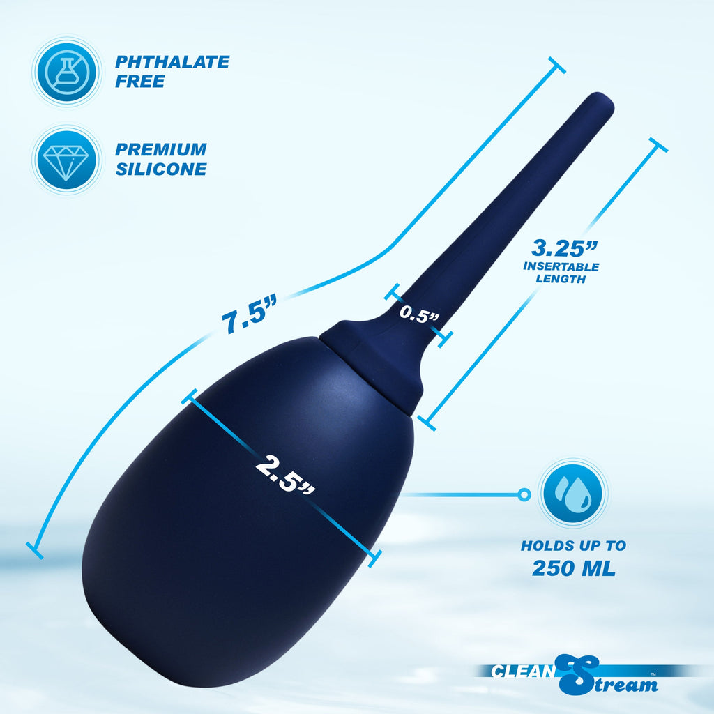 Size: 7.5 inches in height, 2.5 inches in diameter. Bulb holds up to 250 ml or 8 fl oz of liquidMaterial: Silicone Tip and Reservoir, ABS Plastic threaded screw connectionColor: Blue Features a bendable, tapered tip that works with the contours of the bodyEasy to use; just fill it up then fill your partner upMade of body-safe and premium silicone material