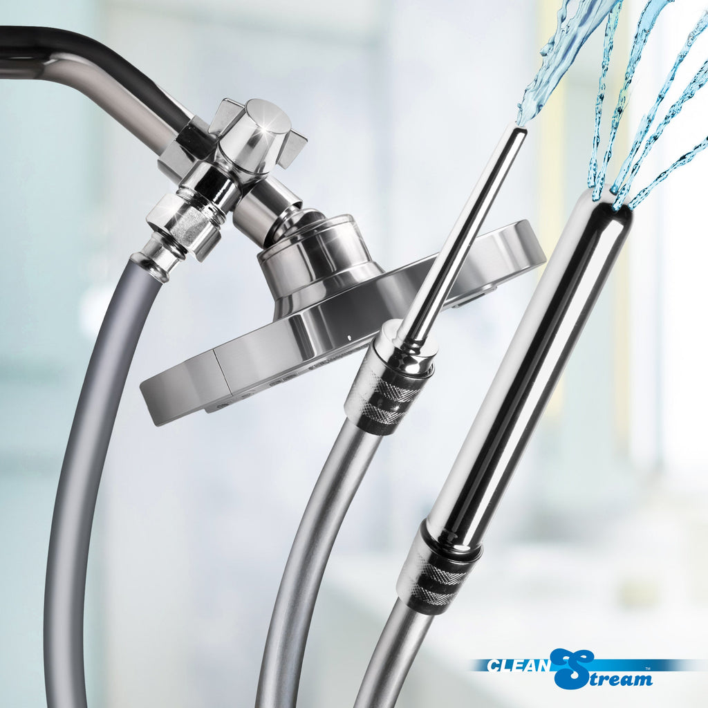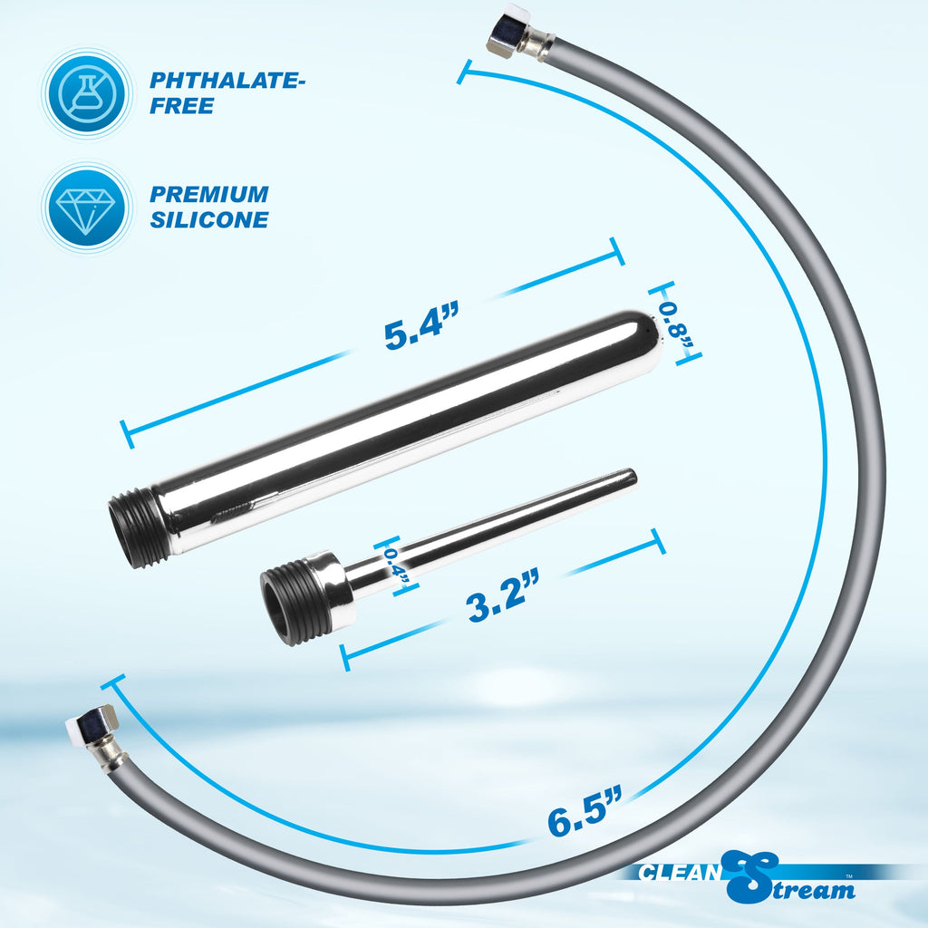The CleanStream Shower Enema Set is designed for men who take preparation seriously. The smooth PVC nozzles feel firm yet lightweight, with a slick, polished surface that allows easy glide when paired with water-based lubricant. The tapered shape supports gradual insertion, while the longer nozzle provides deeper reach for a more thorough cleanse. The flexible 6.5 foot hose gives you room to move, and the solid metal diverter valve allows you to control water pressure with precision, making every step deliberate and controlled.