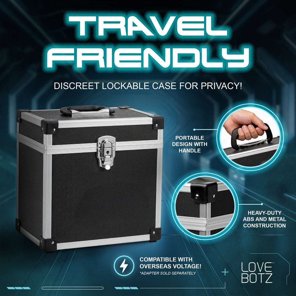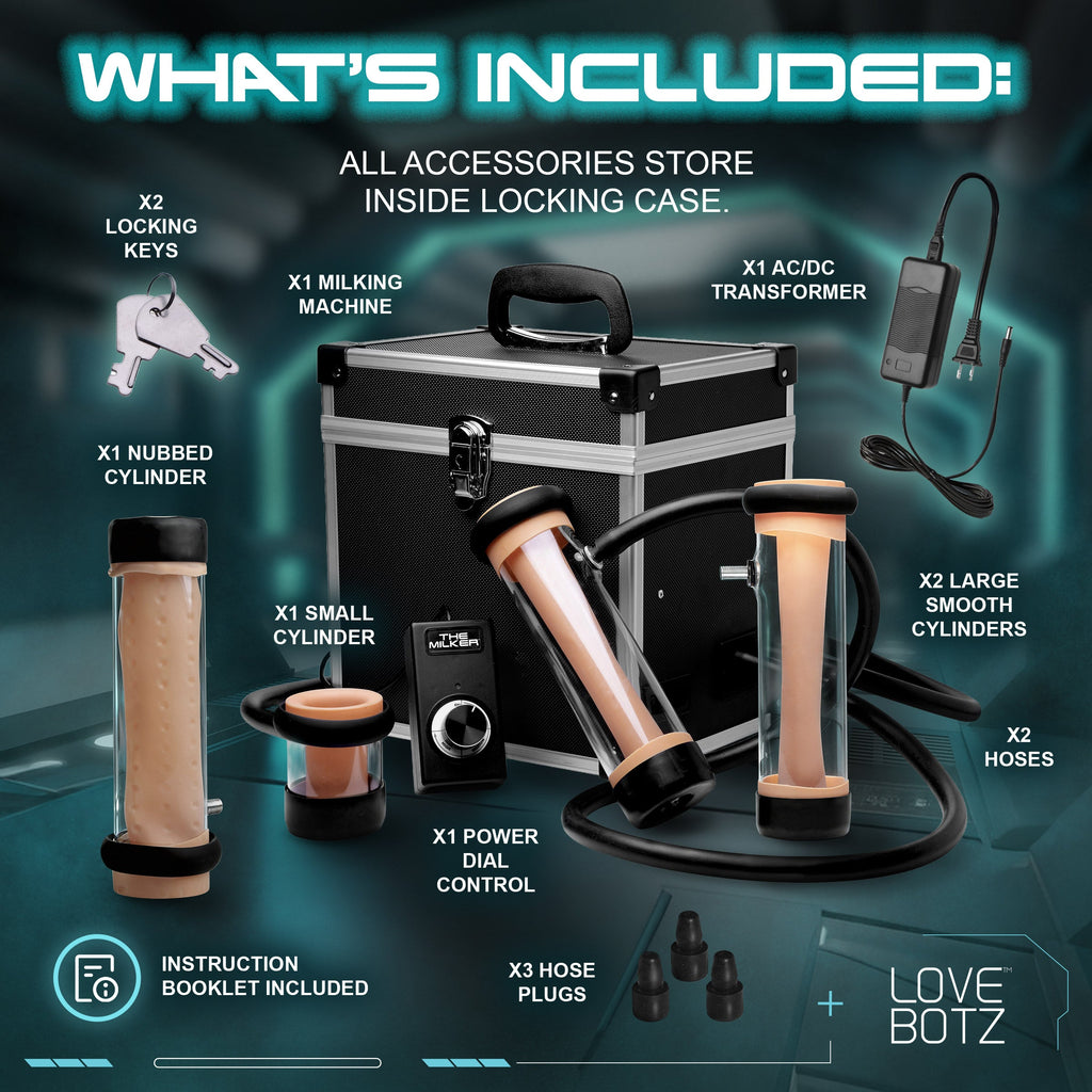 Not only is the sucking action incredible, but The Milker is easy to use and portable. The whole machine is a carrying case in which all of the parts fit in the top. So you can stroll through a hotel lobby without anyone realizing what you're carrying. It even comes with a key to lock it, and keep nosey people from figuring out what it is. When you're ready to use it, just plug in the power cords, speed controller, and pneumatic hoses and you're good to go.