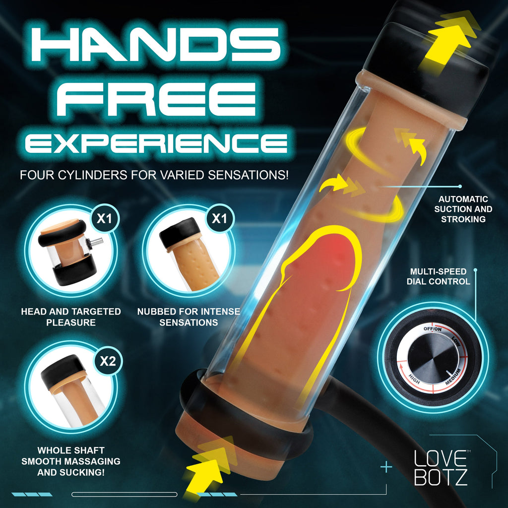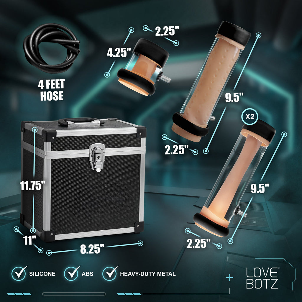 Three different kinds of cylinders are included. The first is specially designed to suck your shaft, at nearly 9 inches long and lined with supple rubber for a tight seal. It feels so good that we've included 2 of them in case you wear out the first! We have also included a textured cylinder, lined with tantalizing nubs that will massage your dick as it's sucked. Finally, the smaller cylinder is for more targeted pleasure, such as your cock head or even the clitoris or nipples.
