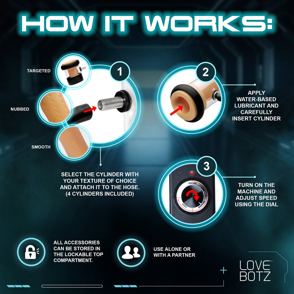 Note: Includes machine, 2 hoses, 3 hose plugs, 2 large smooth cylinders, 1 large nubbed cylinder, and 1 small cylinder, power dial control, 2 locking keys, ACDC transformer, US power cable, and instructions. Compatible with our voltage adapter for overseas orders.